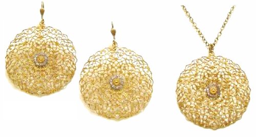 We love this set of 14K gold plated earrings and matching necklace with intricate filigree medallions 1 1/2 inch diameter and earrings have lever backs. Accented with genuine Swarovski crystals. These are so comfortable and you will find you wear them with everything, day or evening.