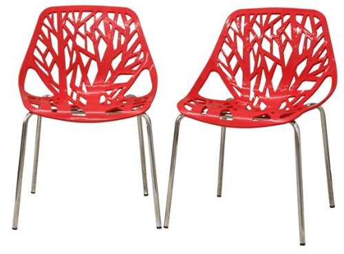 This chair lends a modern touch of the beauty of a white birch tree to your home. The intricate cut-out design is ideal around a minimalistic dining table or simply as a standalone chair in an entryway or extra room. It is constructed with a sturdy molded plastic seat atop a steel frame with a shiny silver chrome finish. Black non-marking feet finish off the chair. This chair is sold as a set of two, is stackable, and assembly is required.