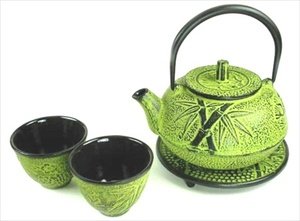 This Cast Iron Tea Set includes: * * 1 Teapot, 2 Teacups, 1 Trivet * * Lime Yellow Color * * Stainless Steel Teapot Strainer Included * * Enamel coating to prevent rusting * * Pattern: Bamboo, Pine, Plum Blossom * * Brand New in Gift Box * Dimension: * Teapot: 5 in Dia. x 4 in H * Teacup: 2-7/8in Dia. x 2in H * Trivet: 5-1/2in Sq. x 3/4in H * Capacity: * Teapot: 18 fl.oz * Teacup: 3.5 fl.oz *